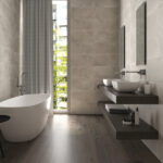 The concrete design shines in this indoor stoneware floor tile that makes up the Beton collection. These porcelain tiles are available in three different shades, ideal for adding serenity and calm to interior spaces.