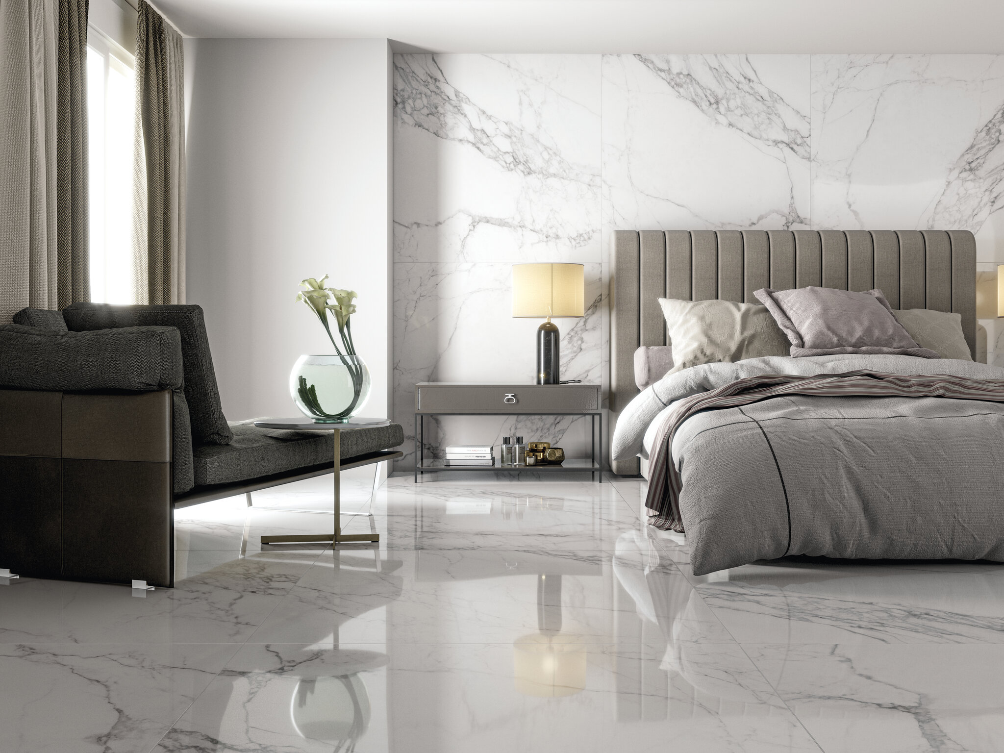 The Capraia series stands out for its delicate purple and grey veins. The shine and expressive power of such a noble material as marble become a design tool to personalise every space with this white marble effect tiles.