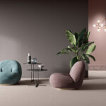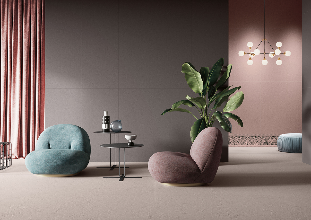 The Chromagic range features wallpaper-inspired patterns paired with resin effect, textured surfaces in rich, solid hues — all crafted in durable porcelain stoneware.