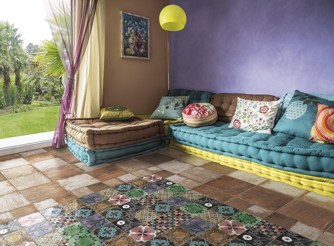 Warmth, colour and craftsmanship. The technological characteristics of this glazed porcelain stoneware – available in five sizes, six shaded colours and numerous designs, reinterprets the South American atmosphere in a modern key.